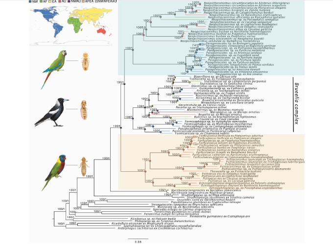Avian feather lice (Phthiraptera: Ischnocera) have undergone morphological diversification into ecomorphs based on how they escape host preening defences. Parrot lice are one prominent example of this phenomenon, with wing, body, or head louse ecomorphs occurring on various groups of parrots. Currently defined genera of parrot lice typically correspond to this ecomorphological variation. Here we explore the phylogenetic relationships among parrot feather lice by sequencing whole genomes and assembling a target set of 2395 nuclear protein coding genes. Phylogenetic trees based on concatenated and coalescent analyses of these data reveal highly supported trees with strong agreement between methods of analysis. These trees reveal that parrot feather lice fall into two separate clades that form a grade with respect to the Brueelia-complex. All parrot louse genera sampled by more than one species were recovered as monophyletic. The evolutionary relationships among these lice showed evidence of strong biogeographic signal, which may also be related to the relationships among their hosts..